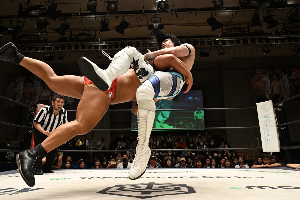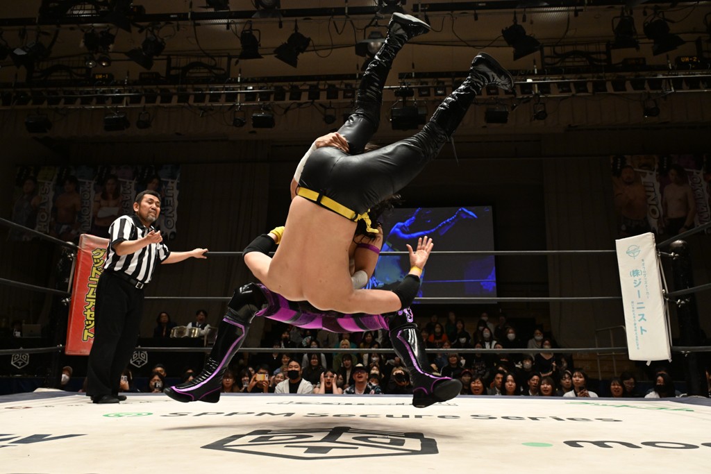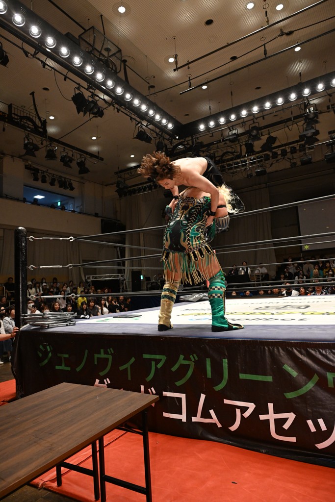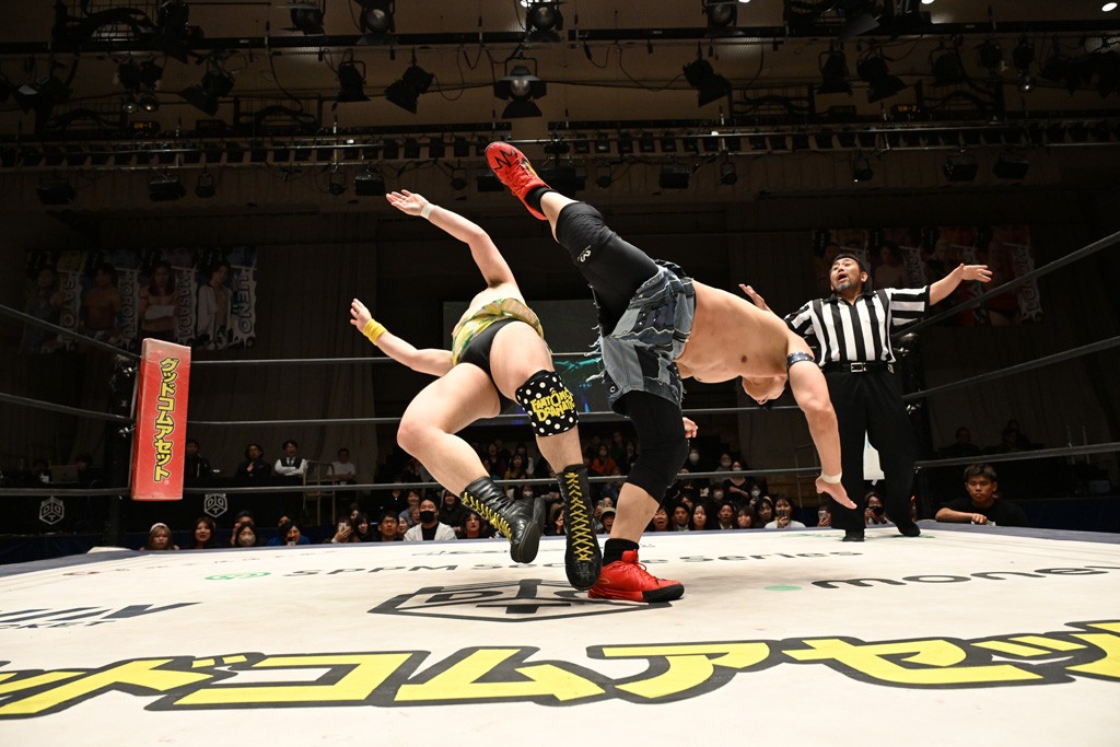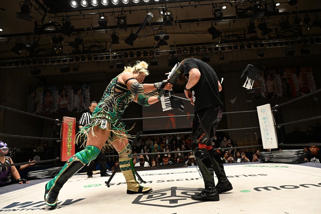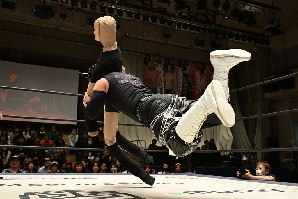 リングに戻ると、飯野はチョップ連打、串刺しボディアタック、キャメルクラッチもエスケープ。上野の投げ捨てジャーマン、飯野のショルダータックルの応酬に。上野はスタンド式シャイニング・ウィザードもカウントは2。上野が雪崩式ブレーンバスター、ラリアット、Blackout Sleeperも、飯野が起き上がって後方に倒れて叩きつけた。飯野は腕を取ってチョップ連打。上野はドロップキック、シットダウンひまわりボムも2カウント。フロッグスプラッシュは飯野がヒザ剣山で阻止。飯野が久々に見せたババボム、低空スピアもフォールは奪えず。上野は突進してきた飯野にフランケンシュタイナーも2カウント。ラリアットの相打ち、飯野のラリアット、スピア連発もカウントは2。飯野はさらにもう一発狙うも、上野はドロップキックで迎撃し、胴締めスリーパーも飯野が脱出。上野は執ような胴締めスリーパーで締め上げると、レフェリーが止めてTKO勝ちが宣せられた。
