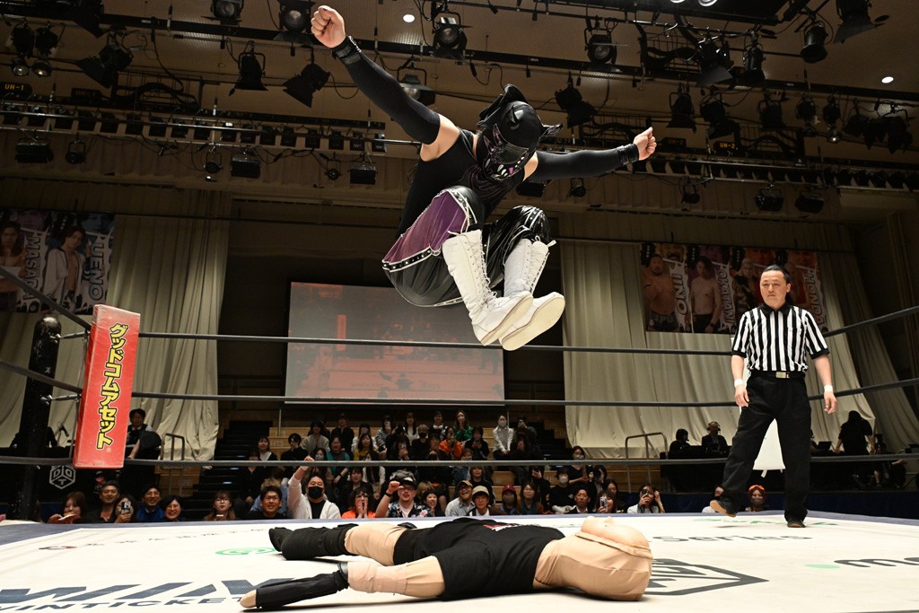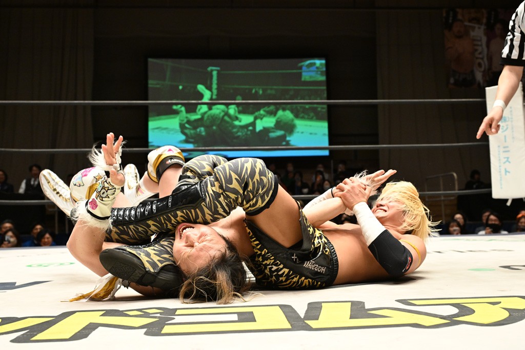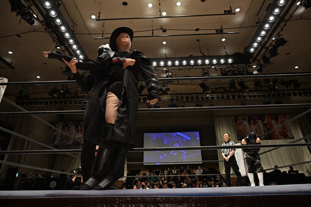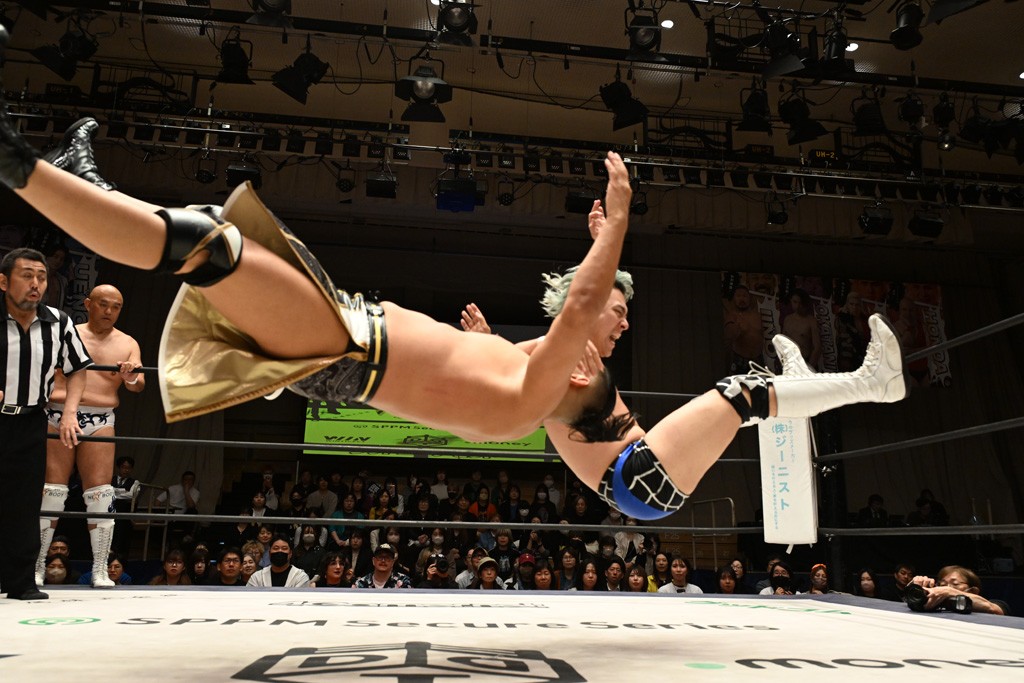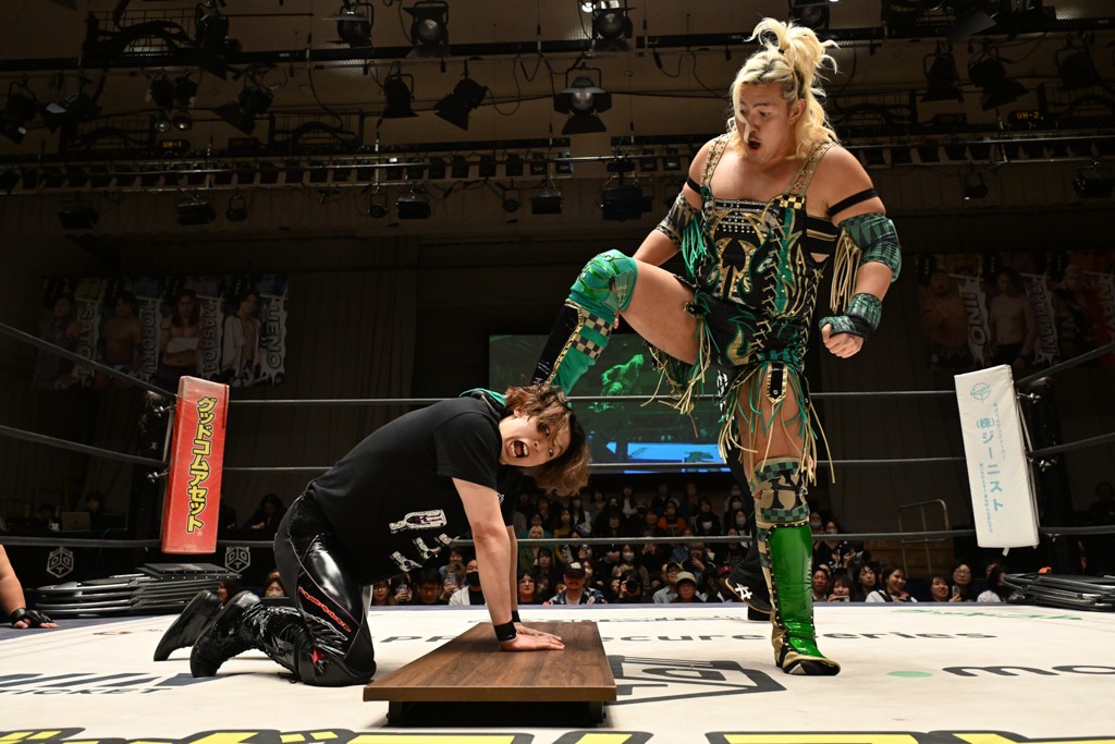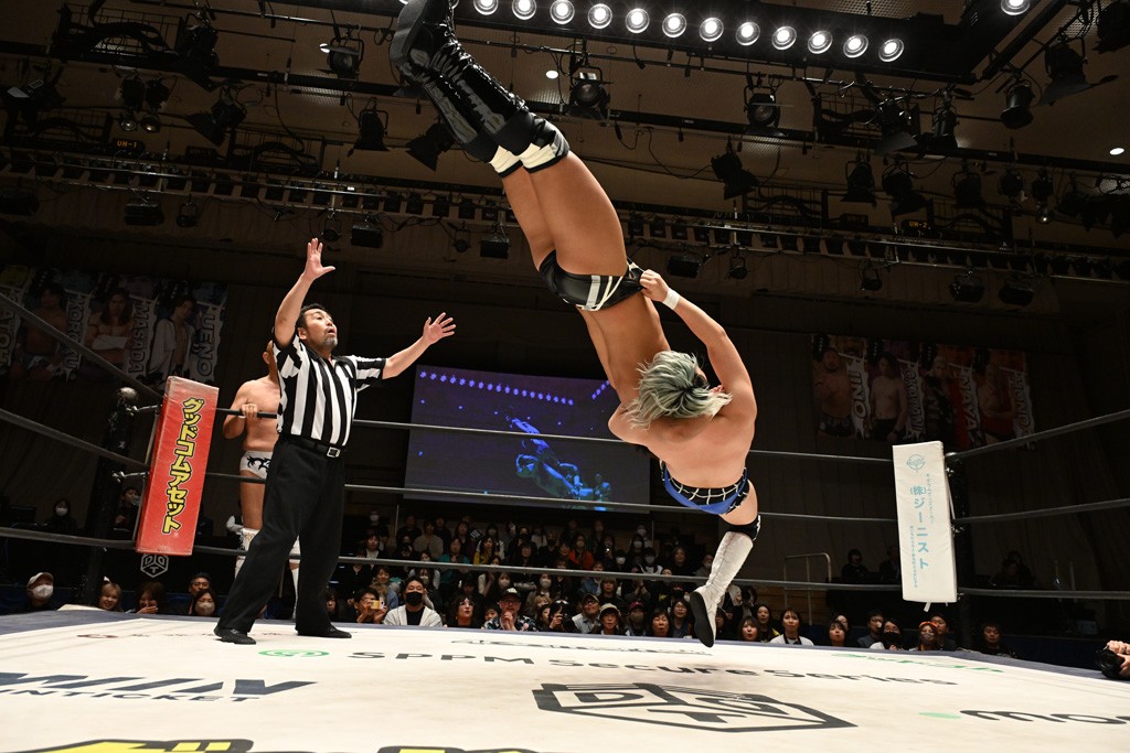 リングに戻ると、飯野はチョップ連打、串刺しボディアタック、キャメルクラッチもエスケープ。上野の投げ捨てジャーマン、飯野のショルダータックルの応酬に。上野はスタンド式シャイニング・ウィザードもカウントは2。上野が雪崩式ブレーンバスター、ラリアット、Blackout Sleeperも、飯野が起き上がって後方に倒れて叩きつけた。飯野は腕を取ってチョップ連打。上野はドロップキック、シットダウンひまわりボムも2カウント。フロッグスプラッシュは飯野がヒザ剣山で阻止。飯野が久々に見せたババボム、低空スピアもフォールは奪えず。上野は突進してきた飯野にフランケンシュタイナーも2カウント。ラリアットの相打ち、飯野のラリアット、スピア連発もカウントは2。飯野はさらにもう一発狙うも、上野はドロップキックで迎撃し、胴締めスリーパーも飯野が脱出。上野は執ような胴締めスリーパーで締め上げると、レフェリーが止めてTKO勝ちが宣せられた。