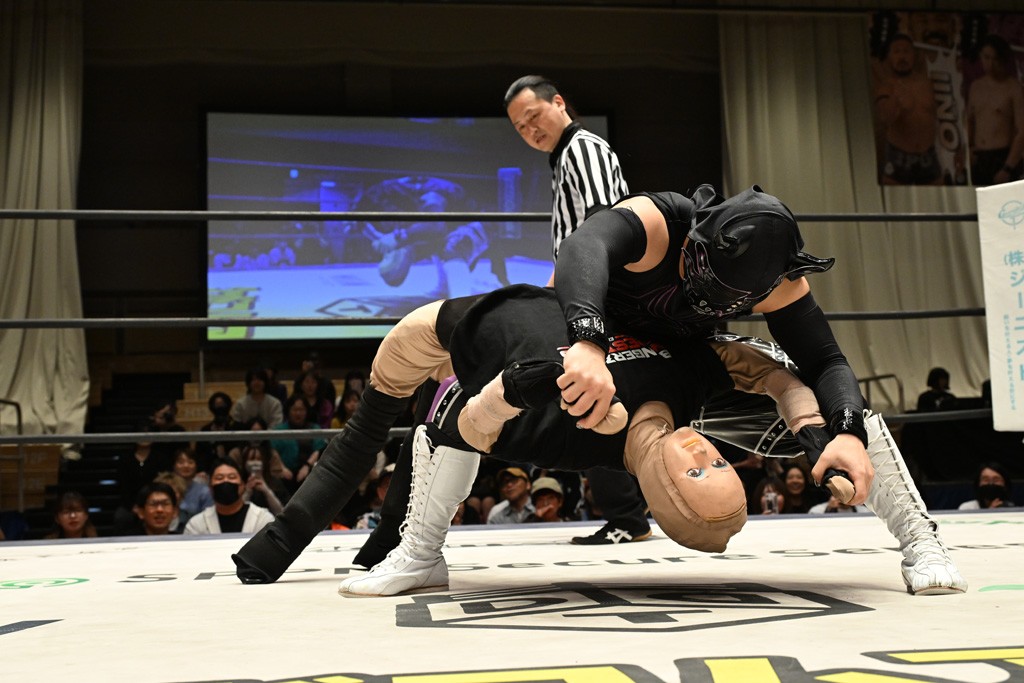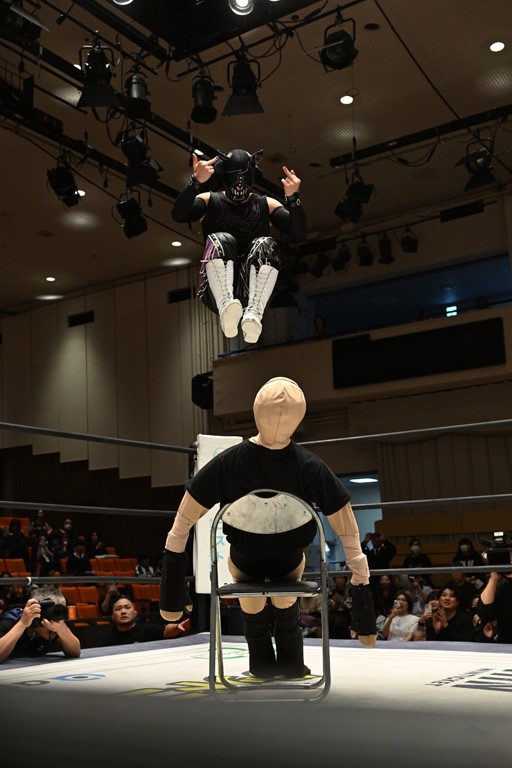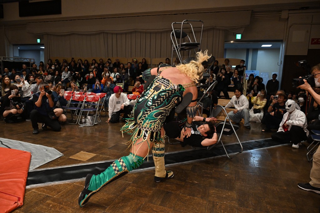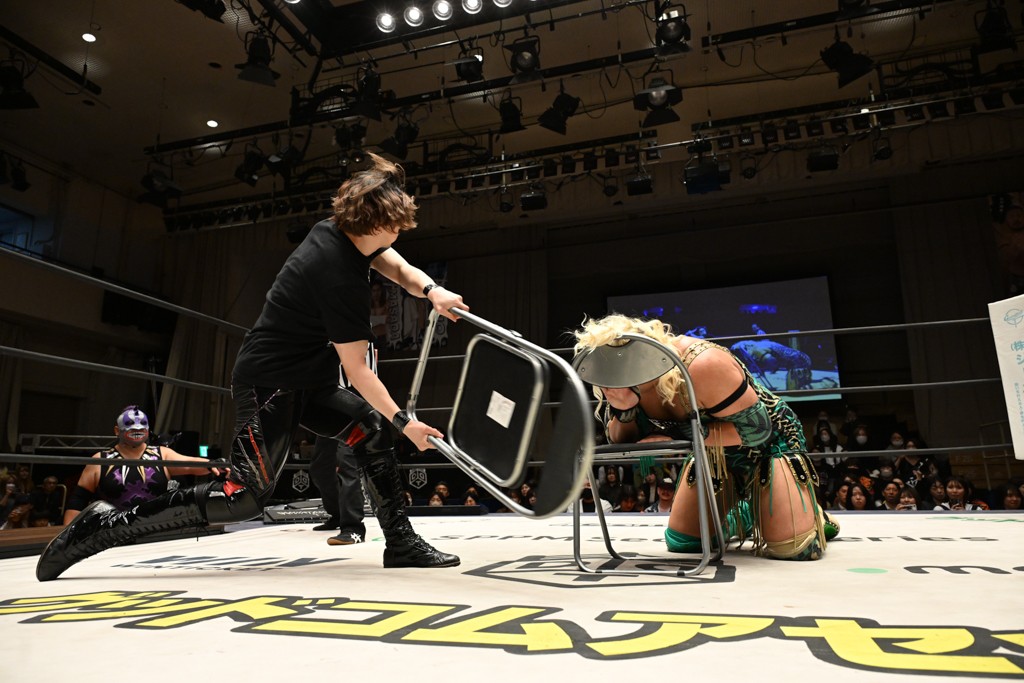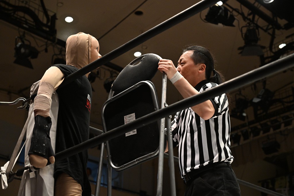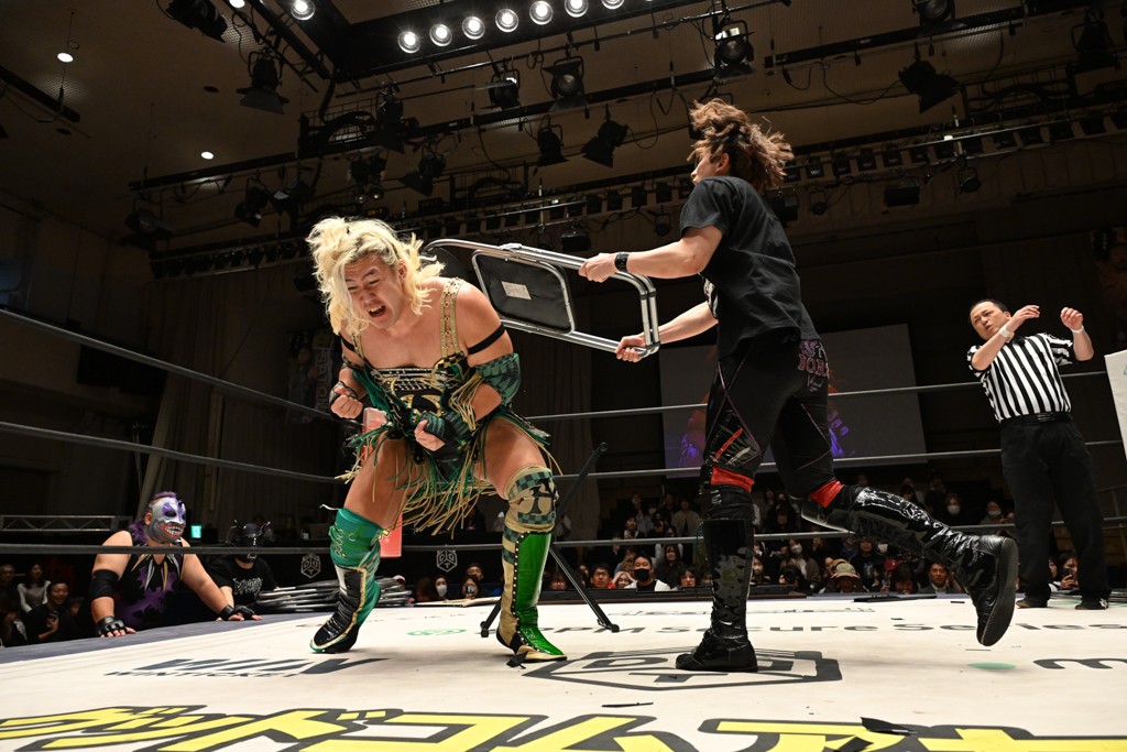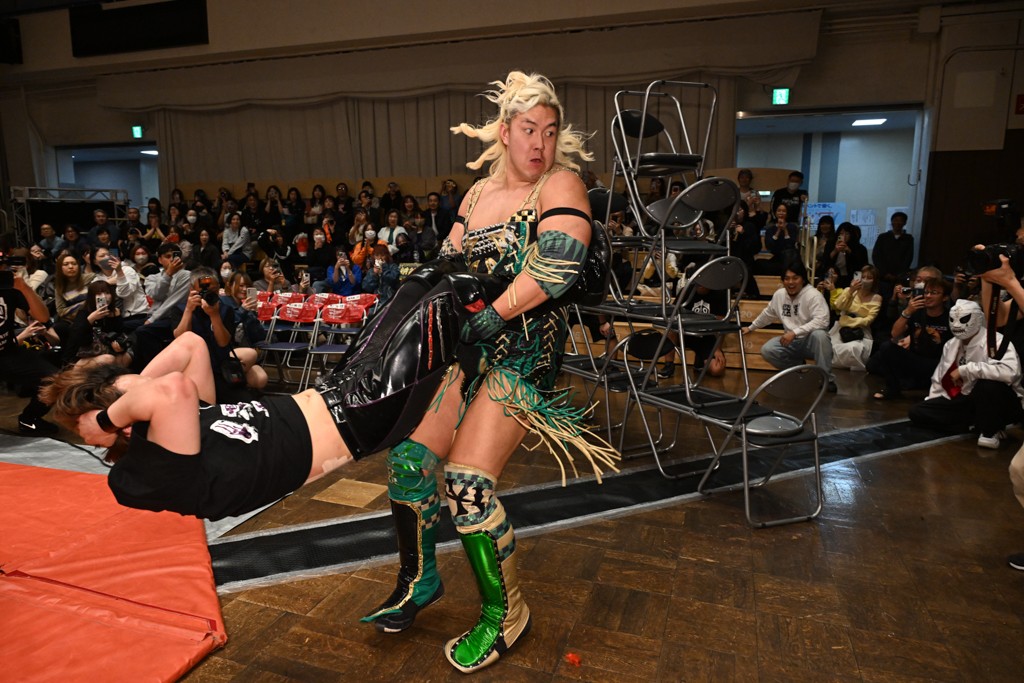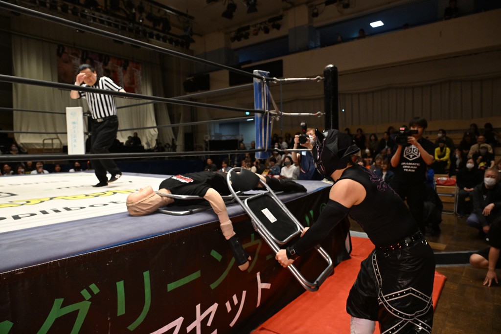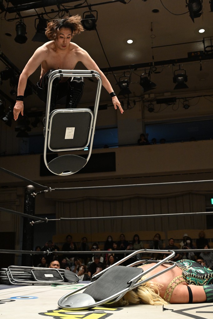 奇襲をかけた岡谷は蹴りで場外に落とす。納谷はテーブルを2つ並べて設置し、チョークスラムを狙うも岡谷は回避。リングインすると、岡谷は寝かせたテーブル上にフェースクラッシャー。さらに持ち込んだボードで頭を殴打。納谷がエプロンから蹴ろうとすると岡谷はイスで迎撃。納谷はジャイアントスイングでぶん回すと、イスの城にぶち当てた。岡谷は立てたテーブルを踏み台に蹴りをぶち込み、クレイモアもカウントは2。納谷は台の上にイスを設置するとチョークスラム、ニーリフトも2カウント。ダイビング・エルボードロップでカバーもセコンドのMJポーがレフェリーの足を引っ張って阻止。レフェリー不在の隙にポー、イルシオンが乱入してやりたい放題。コーナーに上がった岡谷はイスを使ってダイビング・フットスタンプ。エプロンで岡谷がイス殴打。走り込んで回転エビ固め式のパワーボムでテーブルを破壊して勝利を奪った。