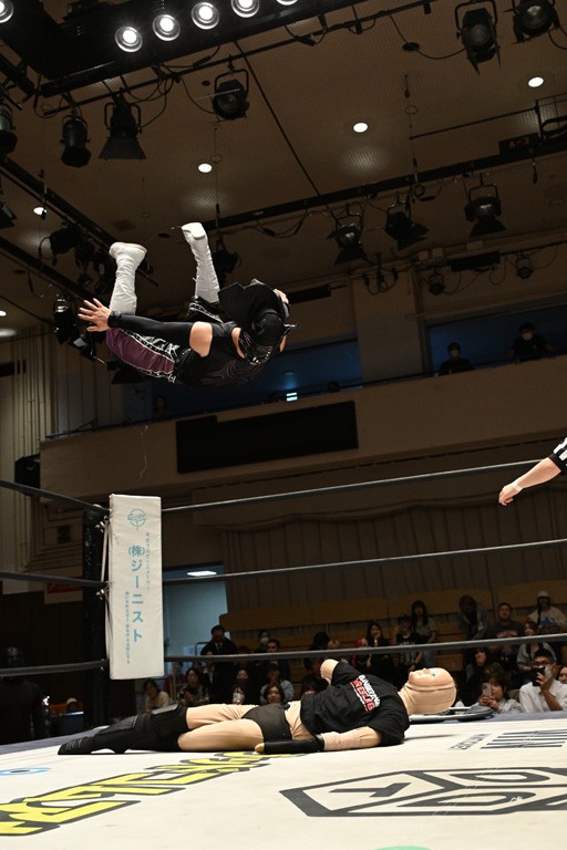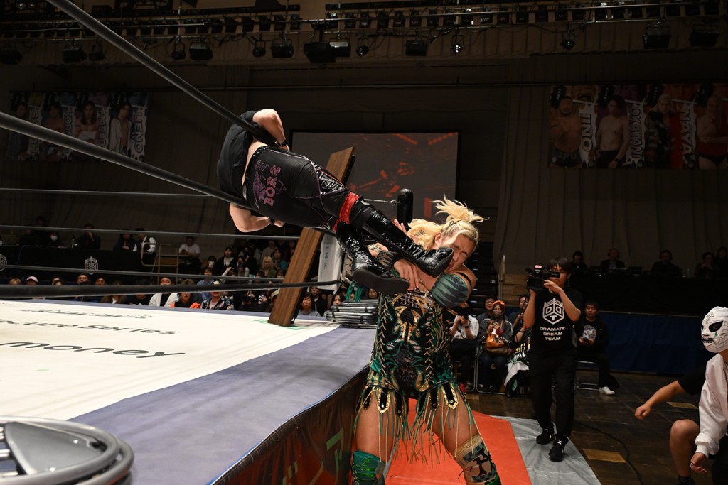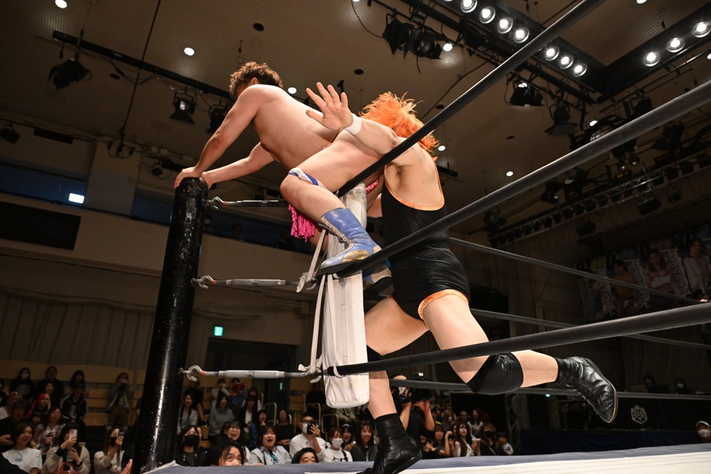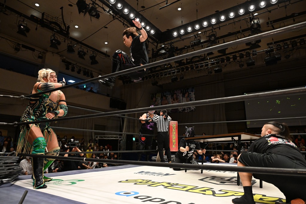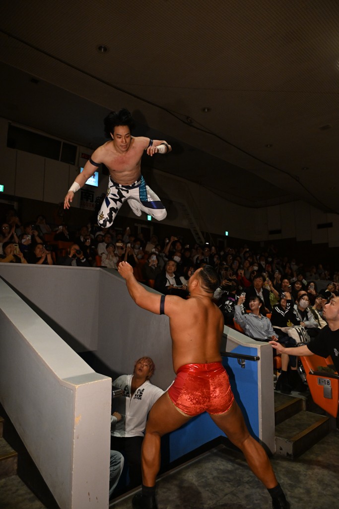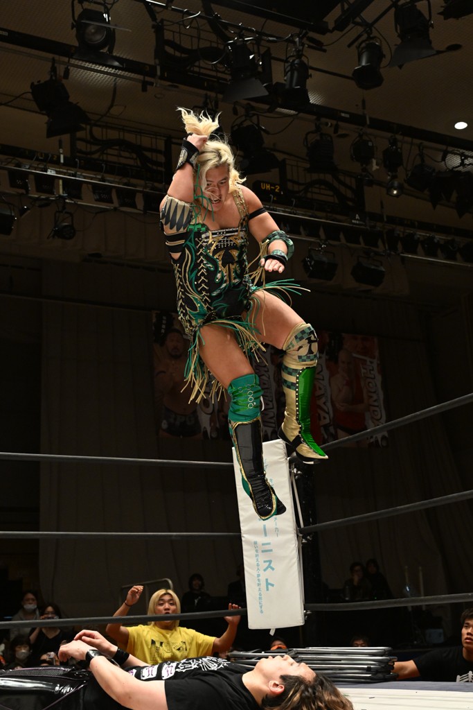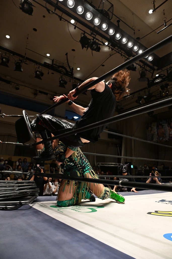 王座奪取に燃える飯野はゴングが鳴ると同時にショルダータックルをぶちかまし、エルボー合戦、ショルダータックル合戦。上野はドロップキックを繰り出すと、場外の飯野めがけてムーンサルト・アタック。飯野は上野を担ぎ上げると、リングの周りを一周し南側客席へ。そこで乱闘になると、上野は階段の上からクロスボディ。それをキャッチした飯野は通路でボディスラム、The Apexエルボー。