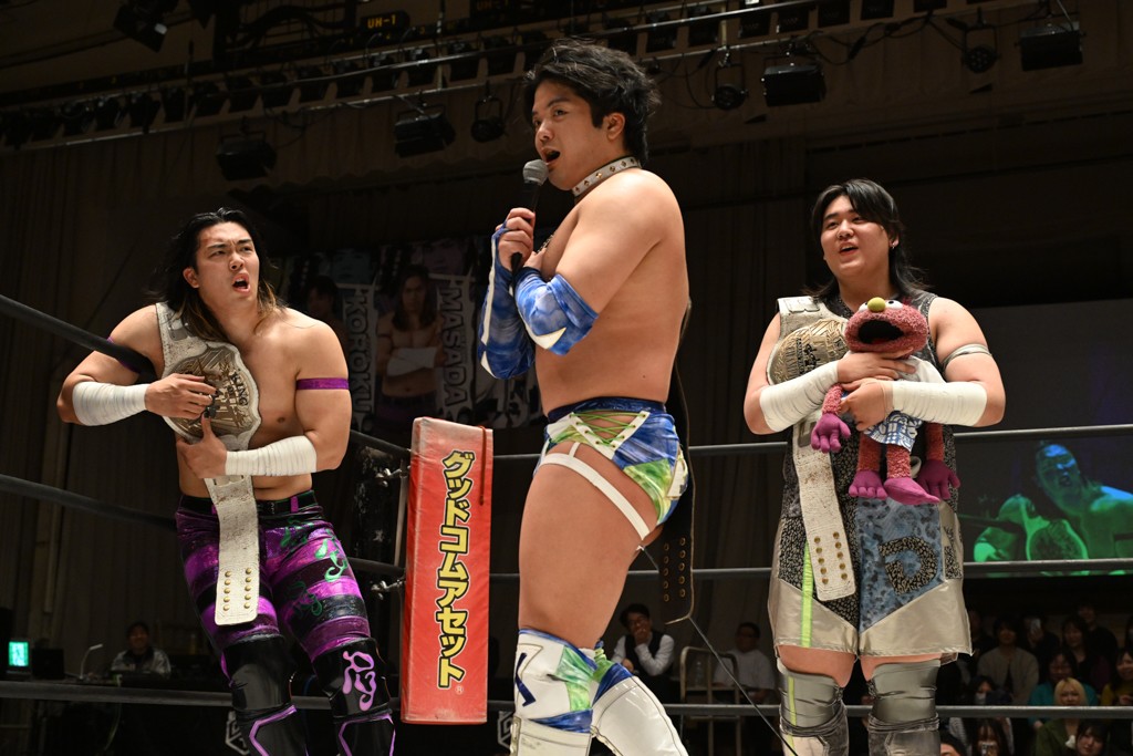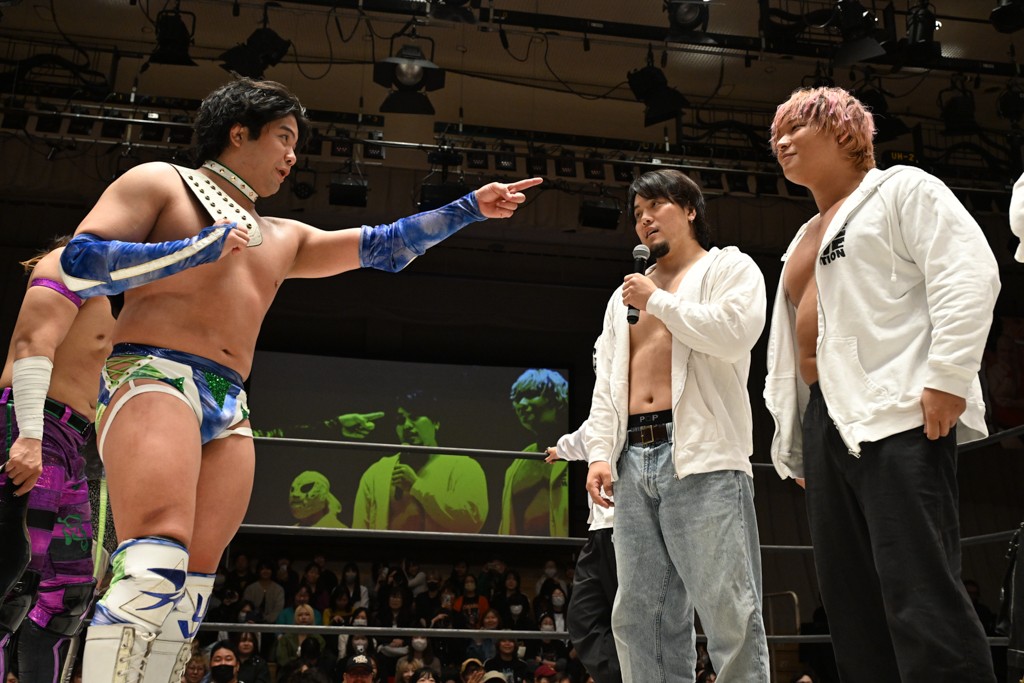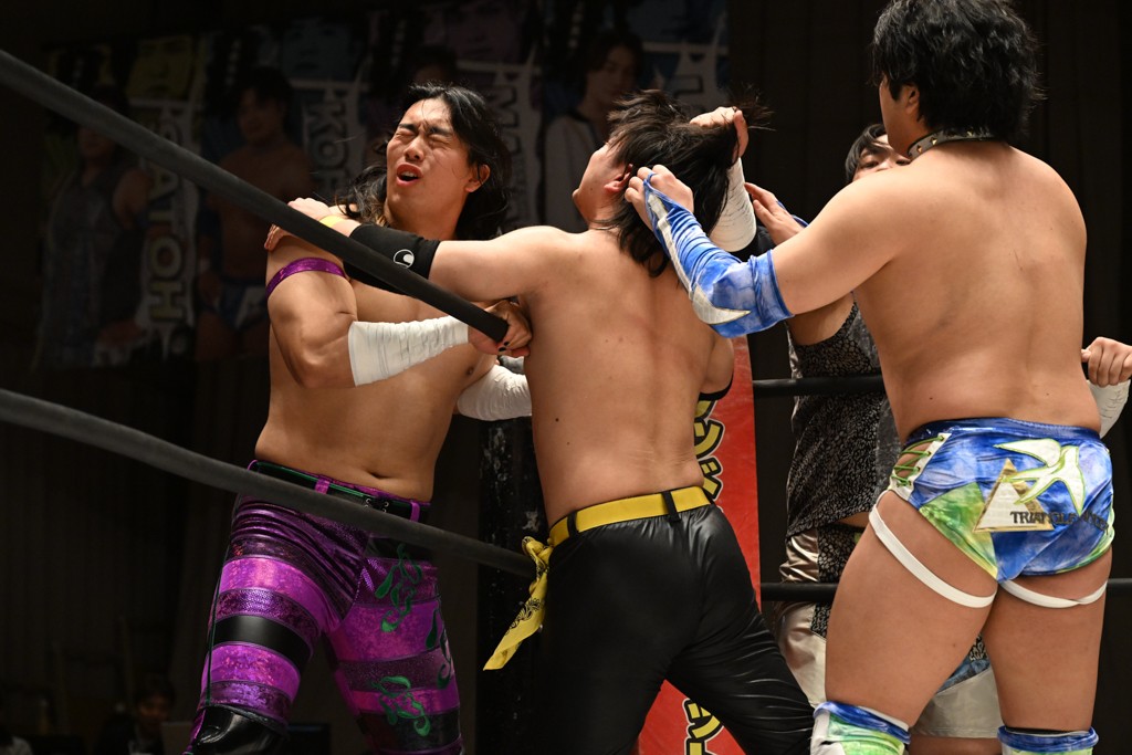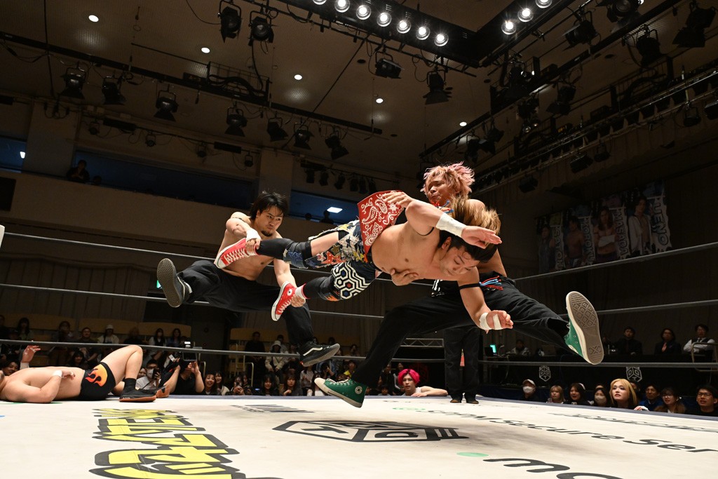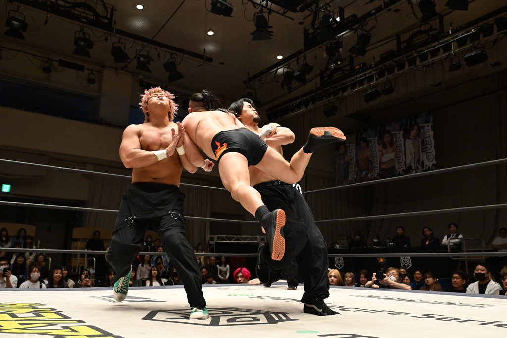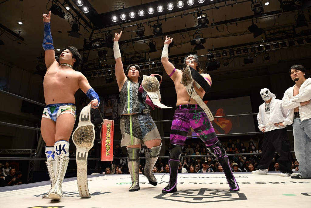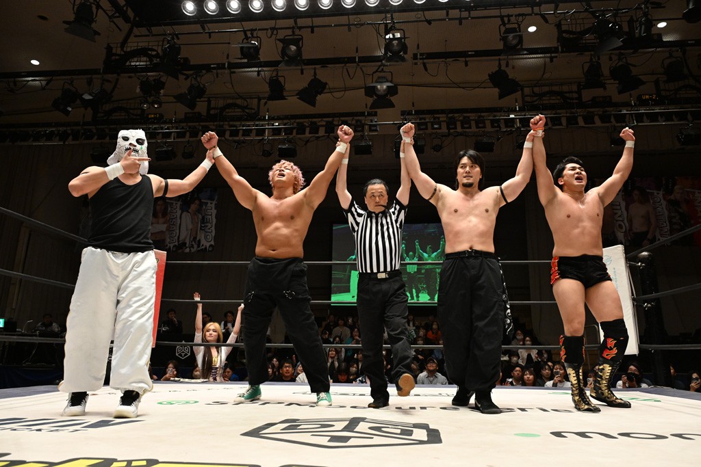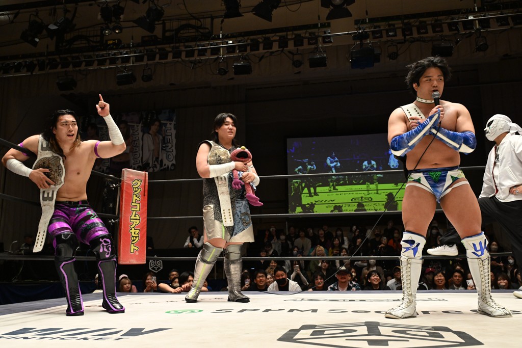 paleyouthの正田壮史&高鹿佑也&佐藤大地がFANTÔMES DRAMATICのクリス・ブルックス&HARASHIMA&葛西陽向を下し、KO-D6人タッグ王座V2に成功。5・2札幌サンプラザでSTRANGE LOVE CONNECTIONのMAO&KANON&ビエント・マリグノが挑戦することが決まった。