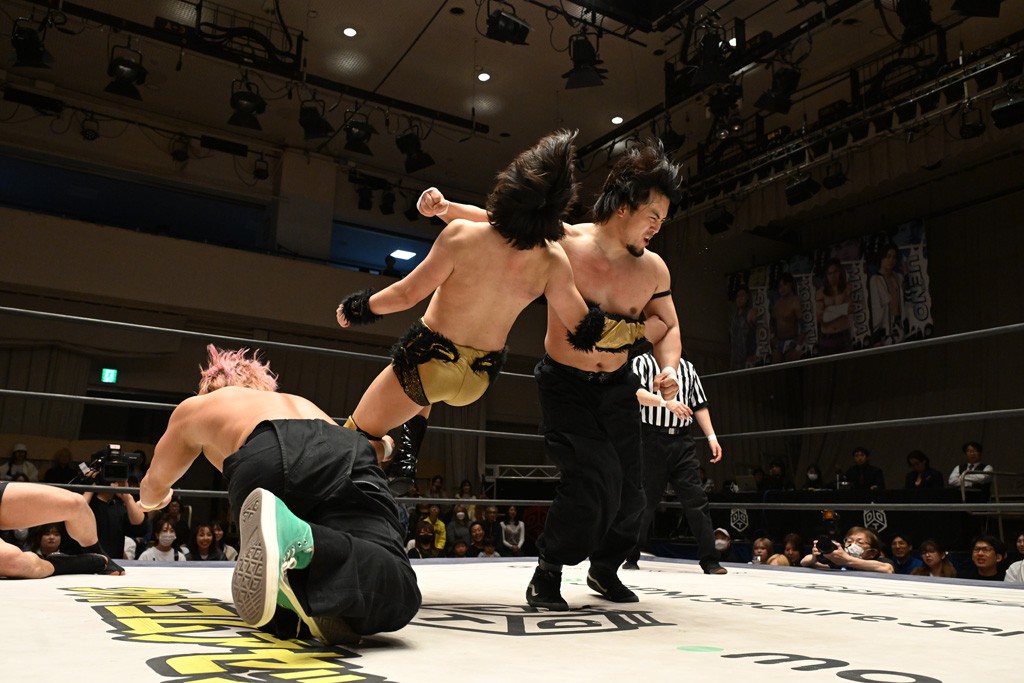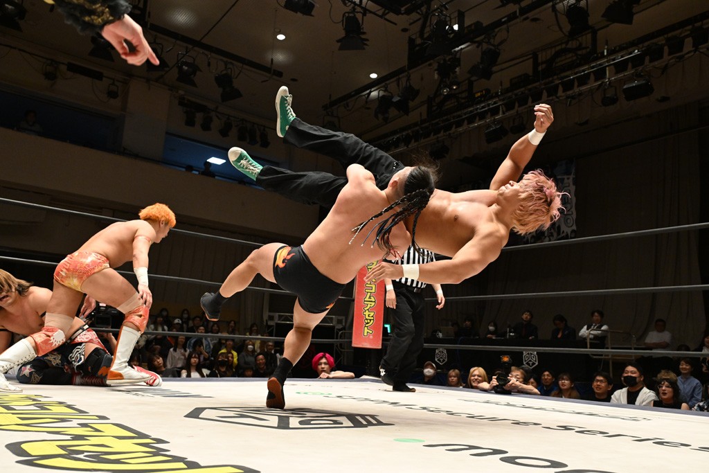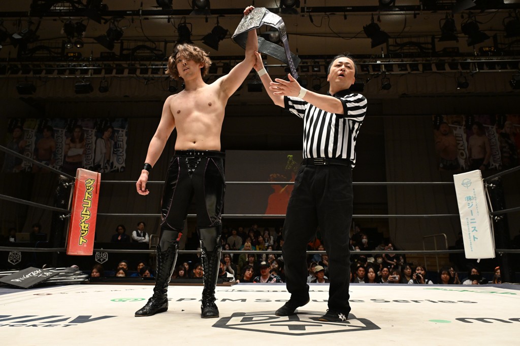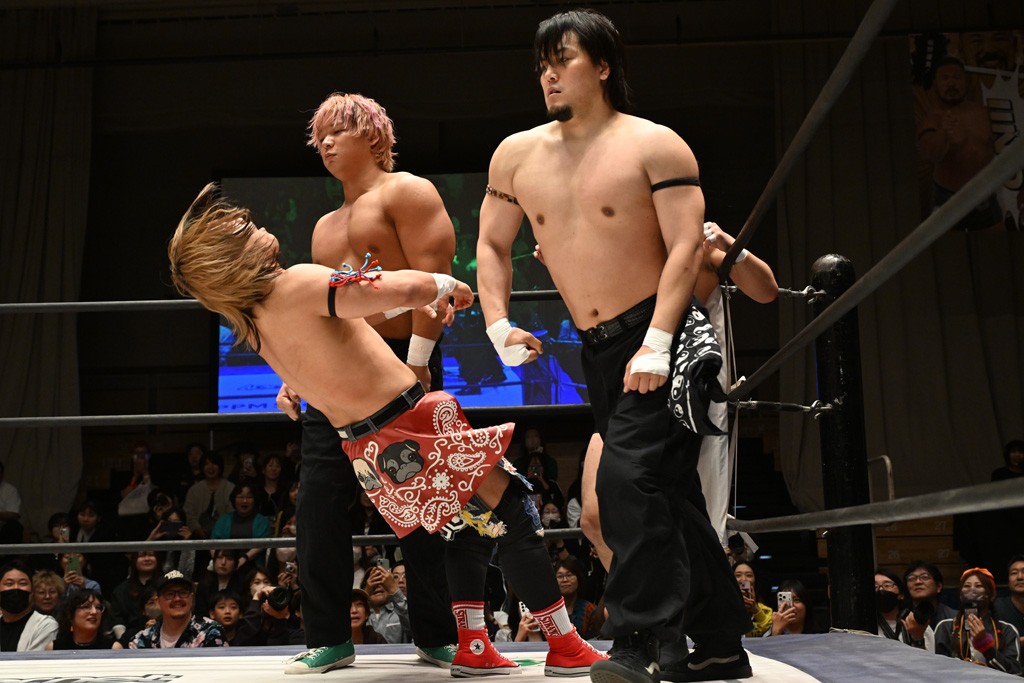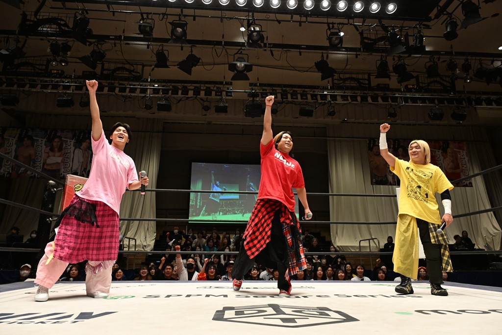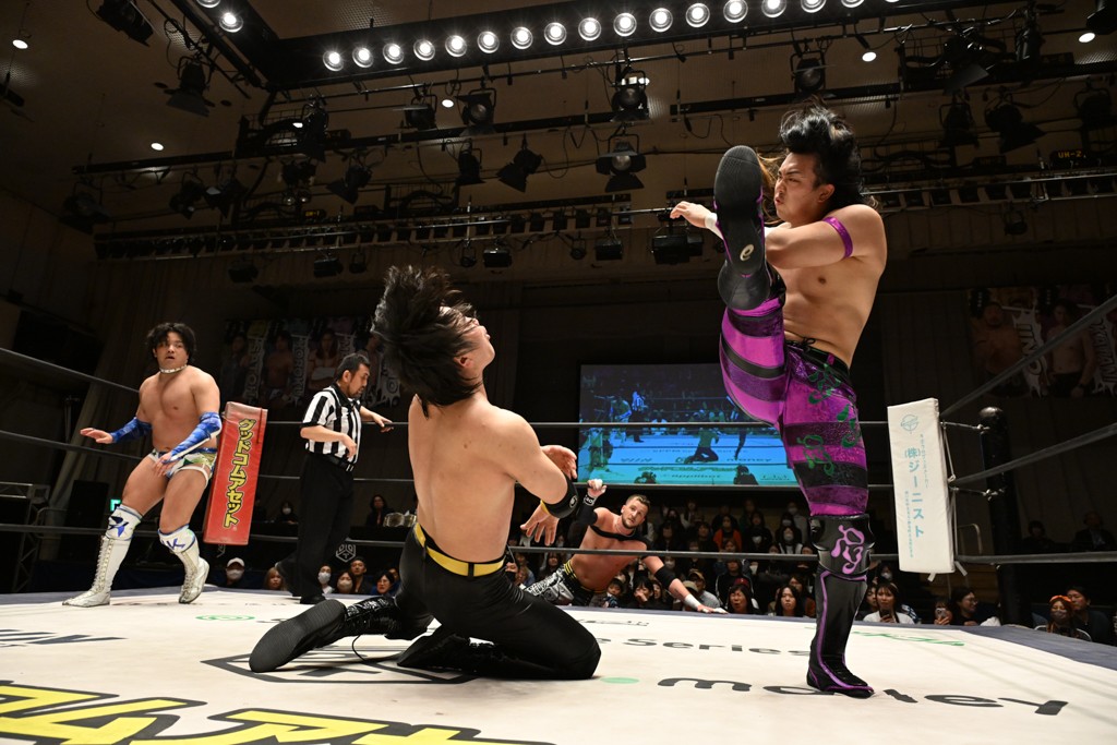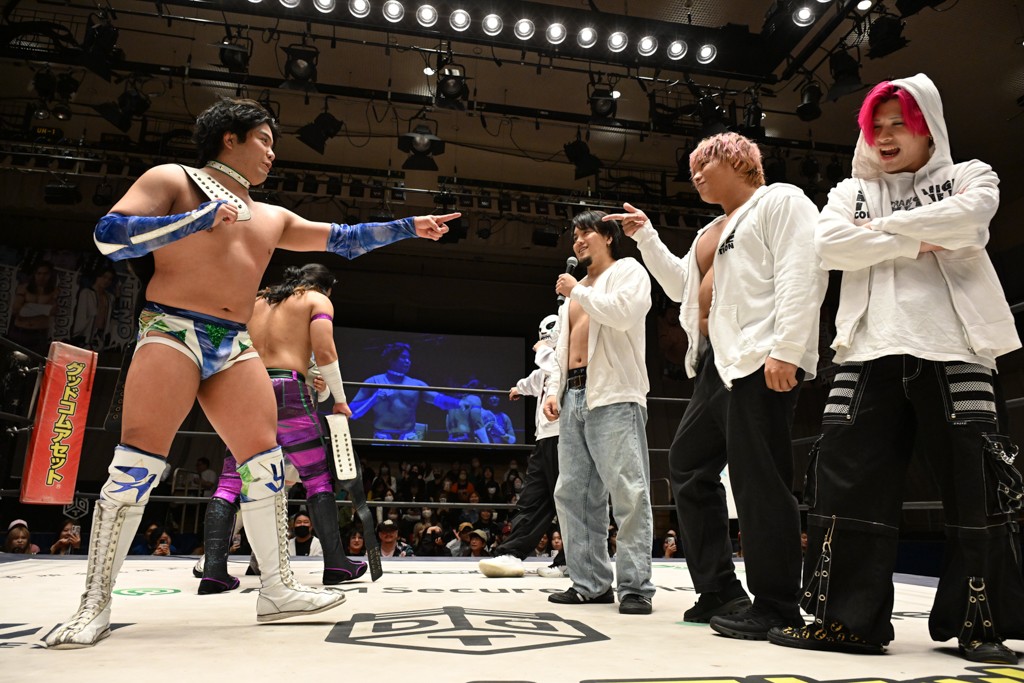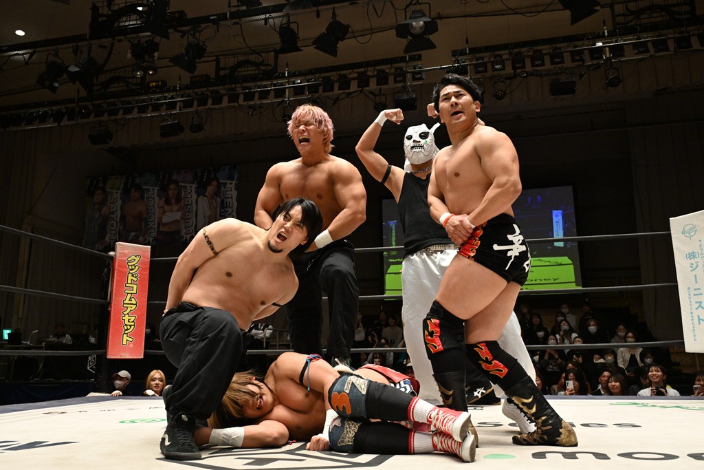 paleyouthの正田壮史&高鹿佑也&佐藤大地がFANTÔMES DRAMATICのクリス・ブルックス&HARASHIMA&葛西陽向を下し、KO-D6人タッグ王座V2に成功。5・2札幌サンプラザでSTRANGE LOVE CONNECTIONのMAO&KANON&ビエント・マリグノが挑戦することが決まった。