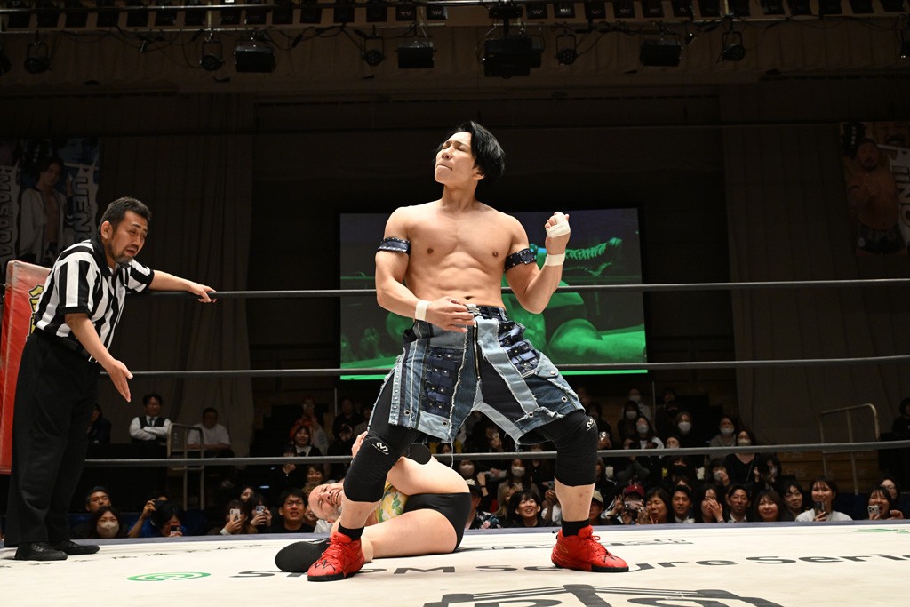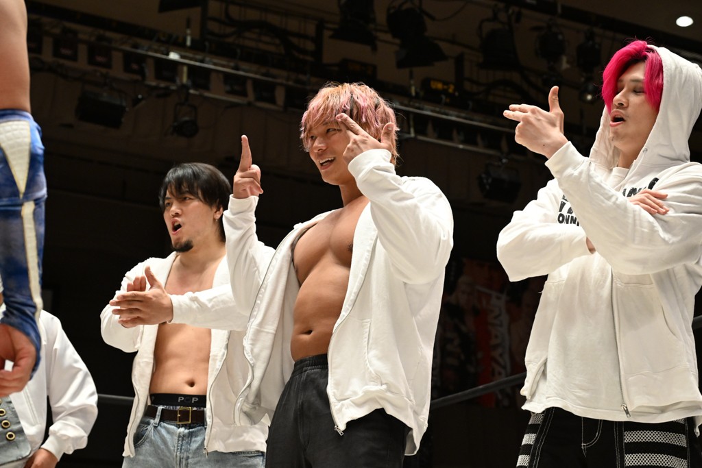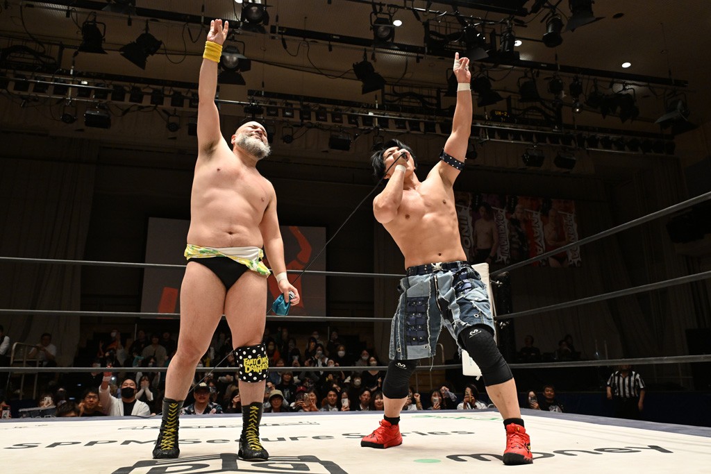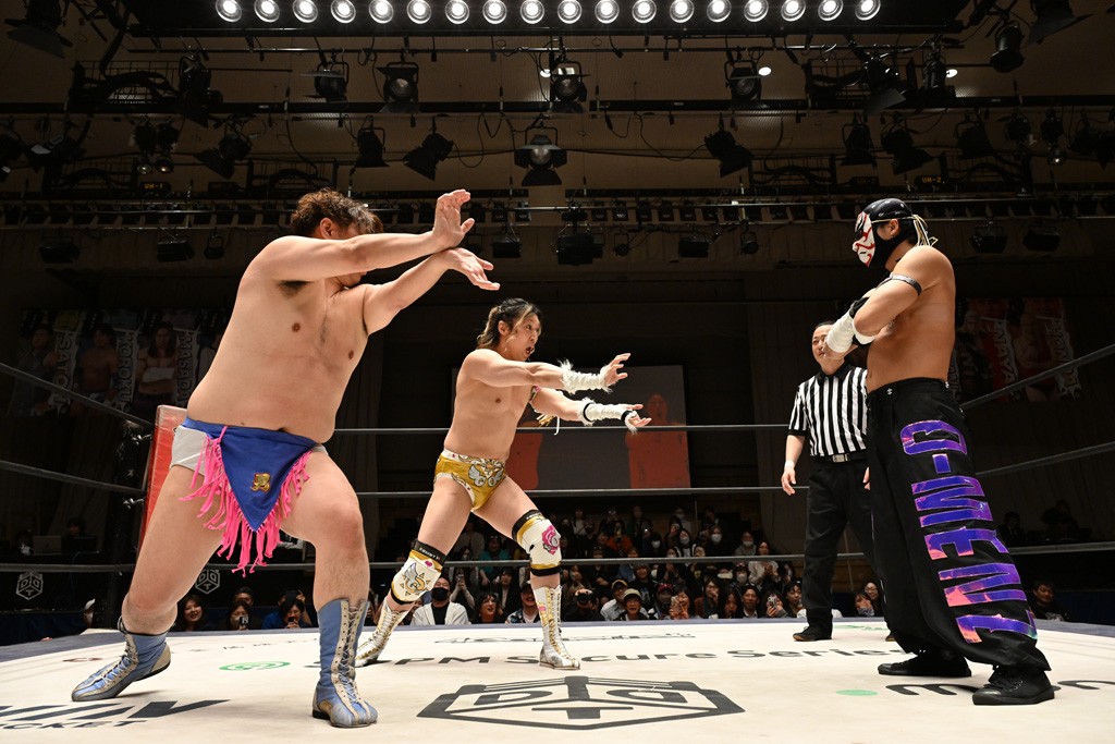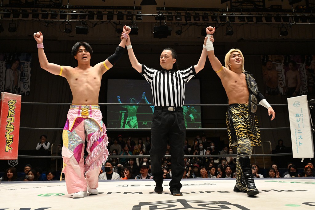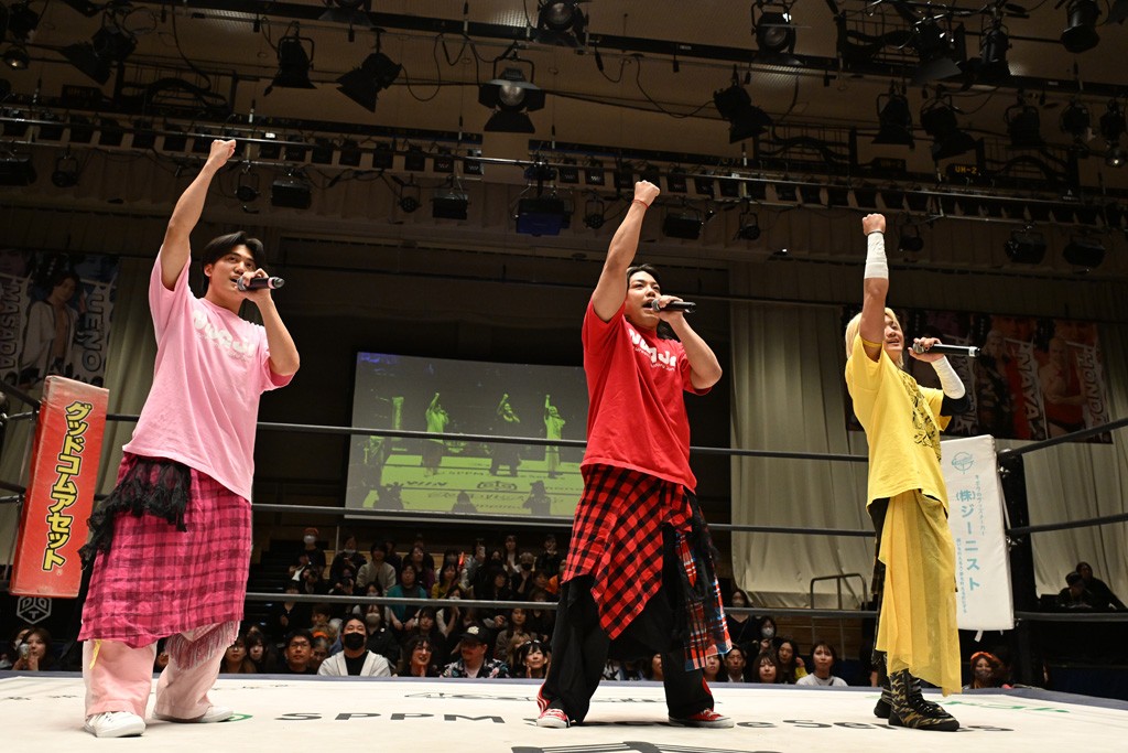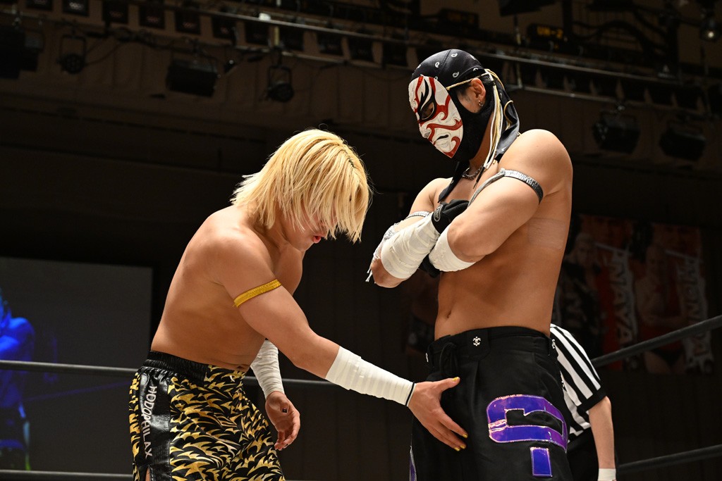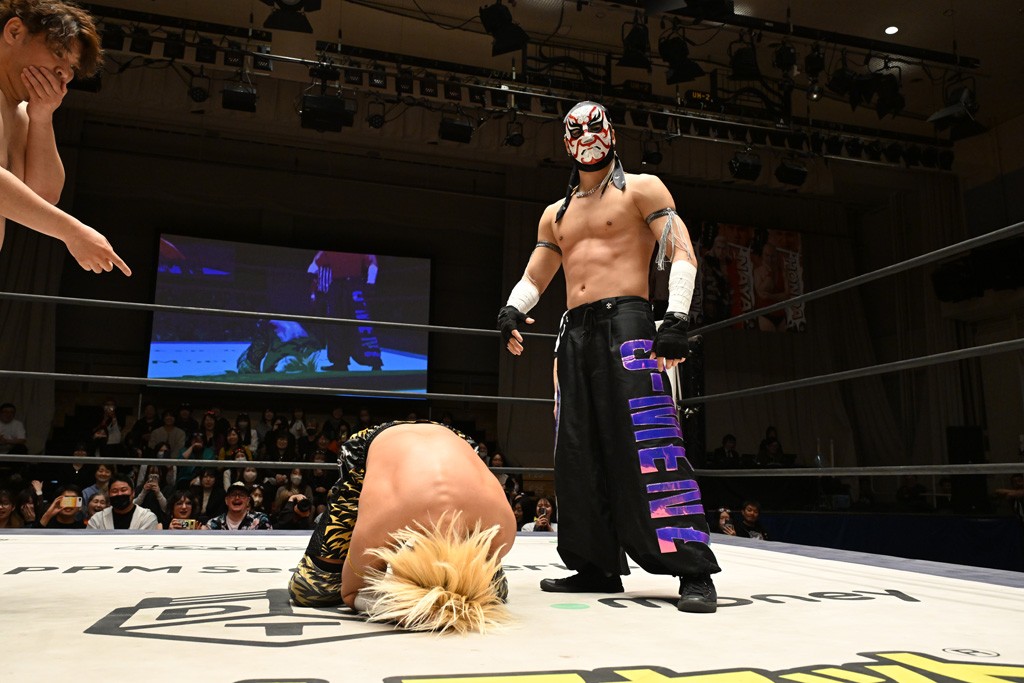 paleyouthの正田壮史&高鹿佑也&佐藤大地がFANTÔMES DRAMATICのクリス・ブルックス&HARASHIMA&葛西陽向を下し、KO-D6人タッグ王座V2に成功。5・2札幌サンプラザでSTRANGE LOVE CONNECTIONのMAO&KANON&ビエント・マリグノが挑戦することが決まった。