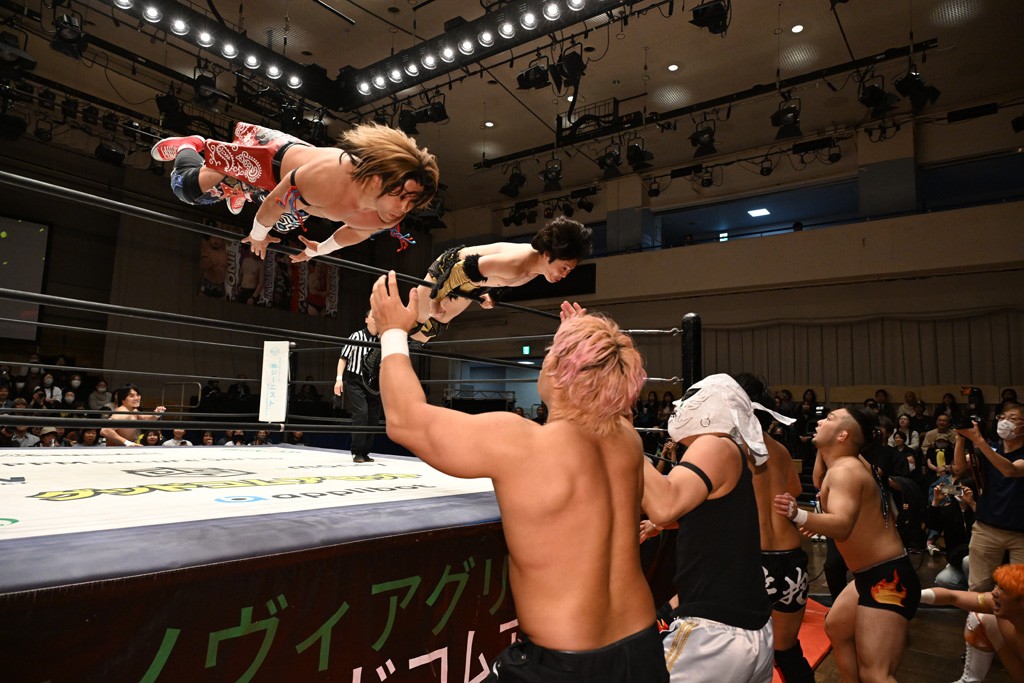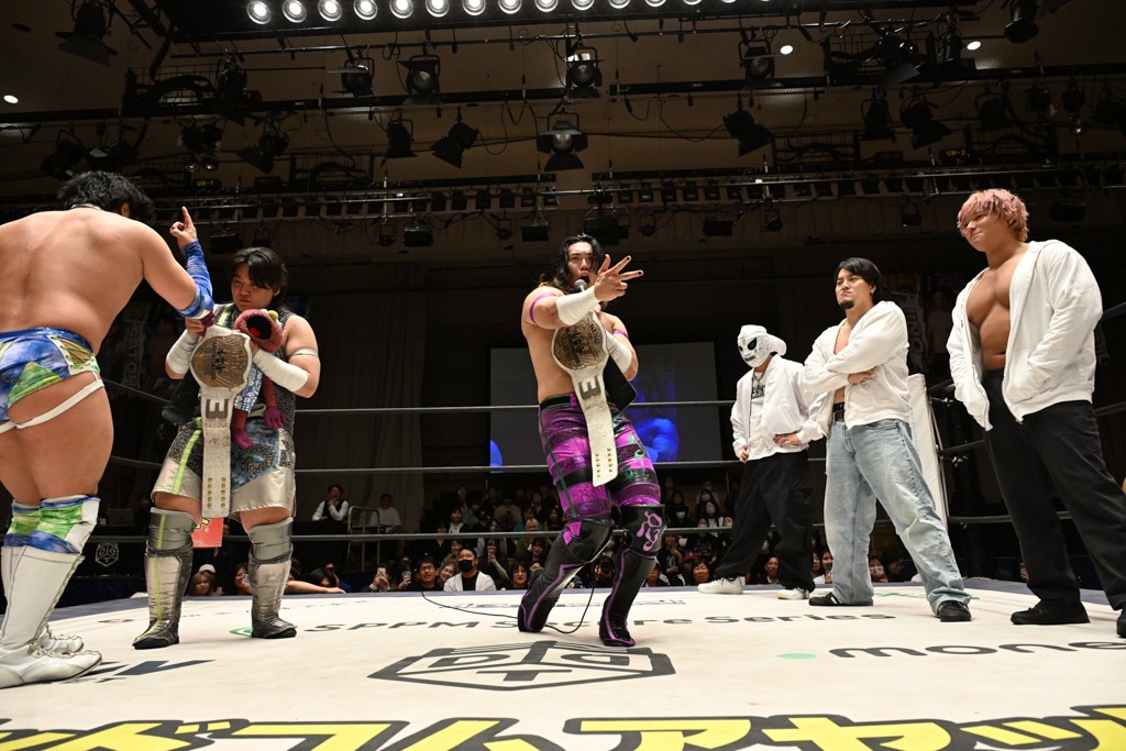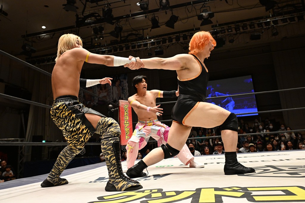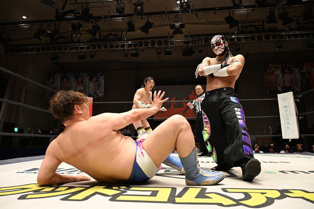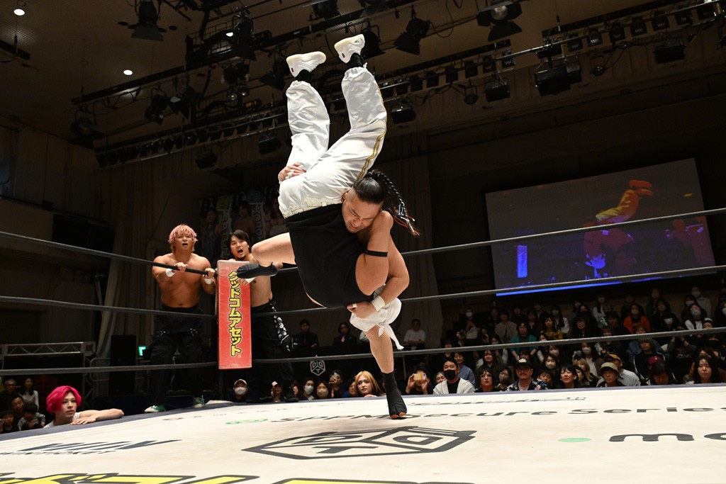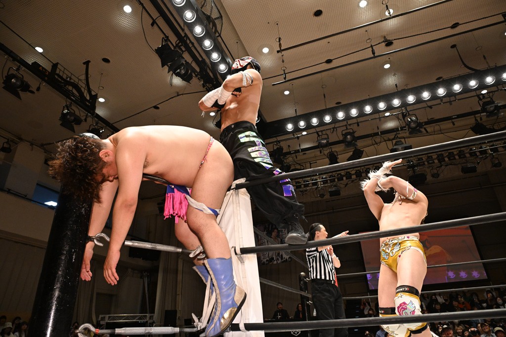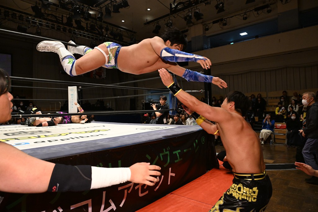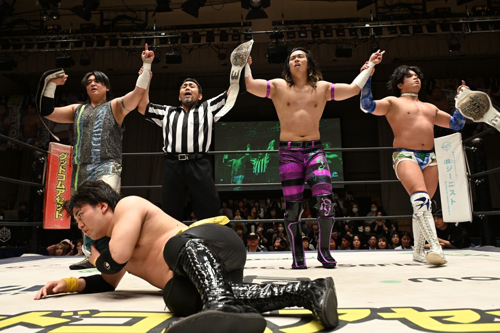 paleyouthの正田壮史&高鹿佑也&佐藤大地がFANTÔMES DRAMATICのクリス・ブルックス&HARASHIMA&葛西陽向を下し、KO-D6人タッグ王座V2に成功。5・2札幌サンプラザでSTRANGE LOVE CONNECTIONのMAO&KANON&ビエント・マリグノが挑戦することが決まった。