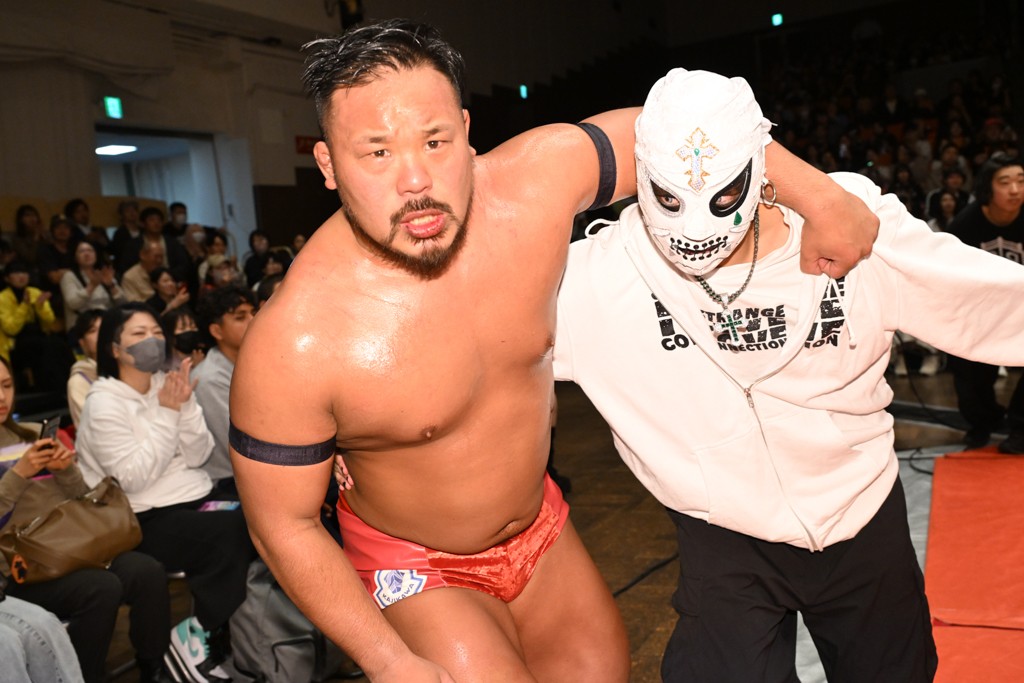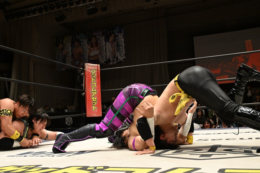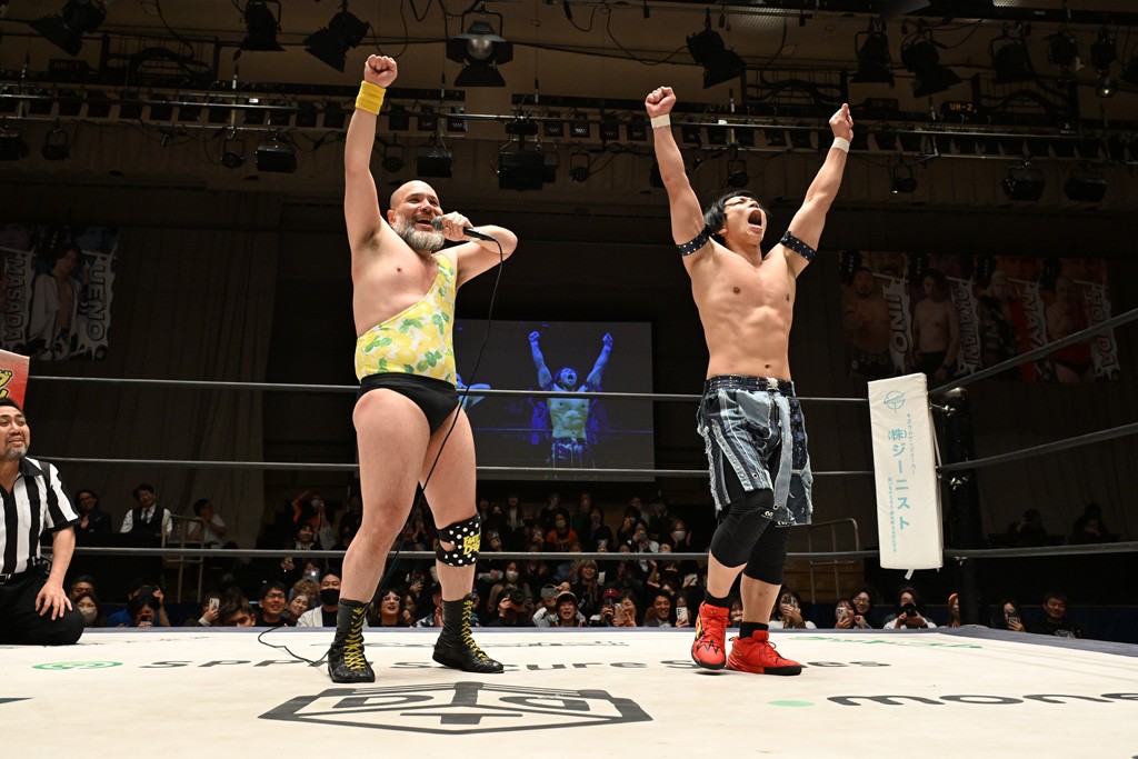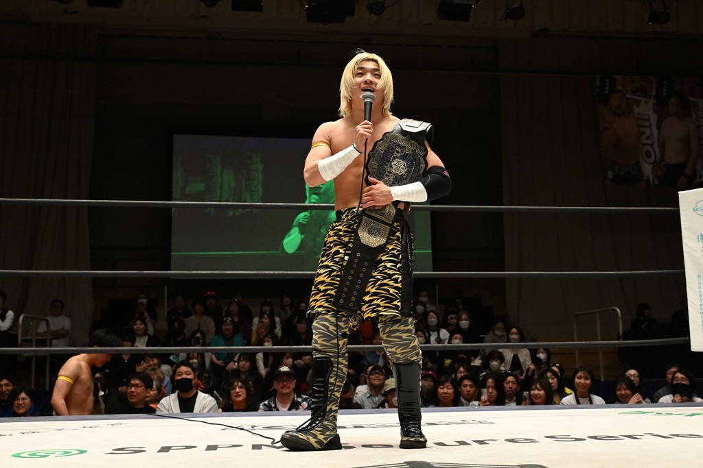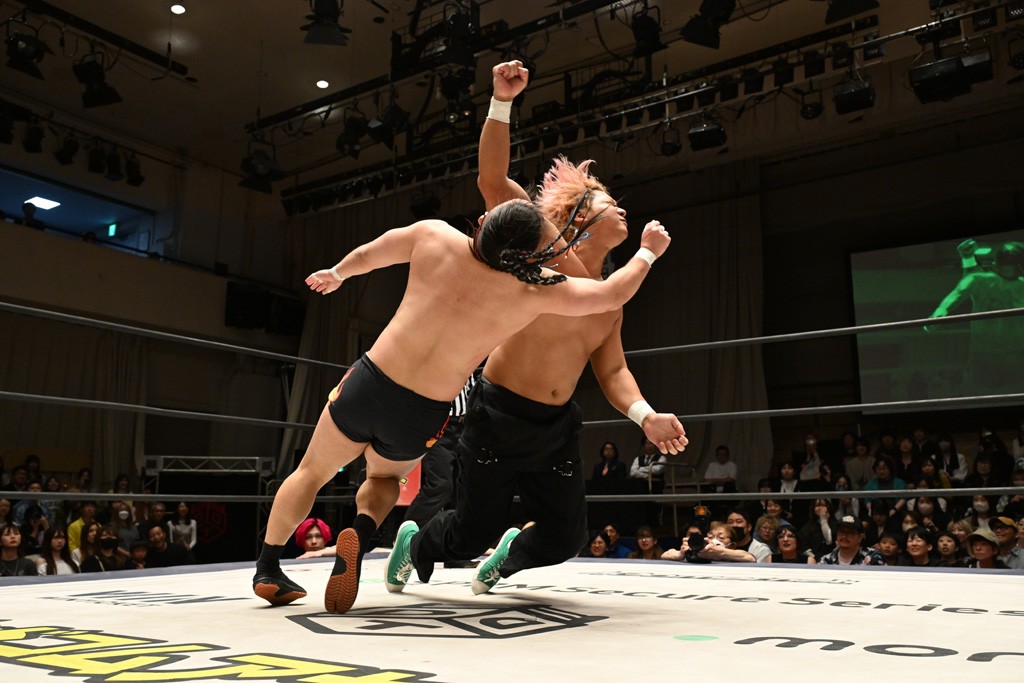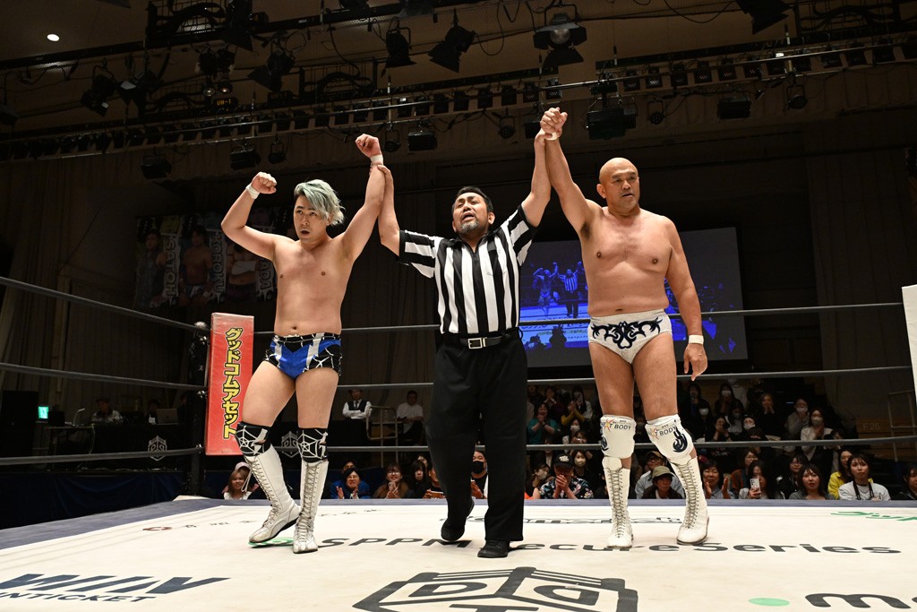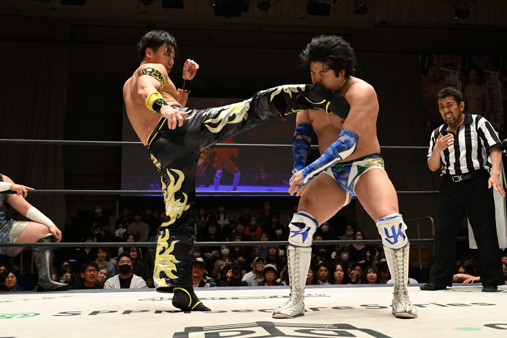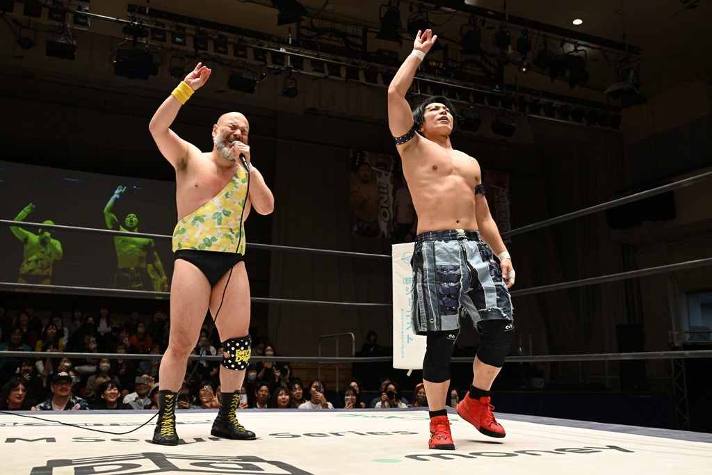 paleyouthの正田壮史&高鹿佑也&佐藤大地がFANTÔMES DRAMATICのクリス・ブルックス&HARASHIMA&葛西陽向を下し、KO-D6人タッグ王座V2に成功。5・2札幌サンプラザでSTRANGE LOVE CONNECTIONのMAO&KANON&ビエント・マリグノが挑戦することが決まった。