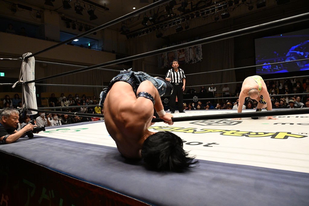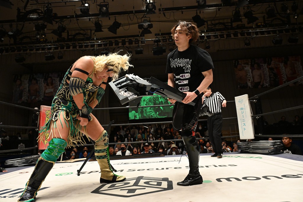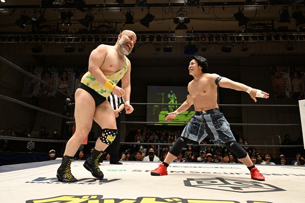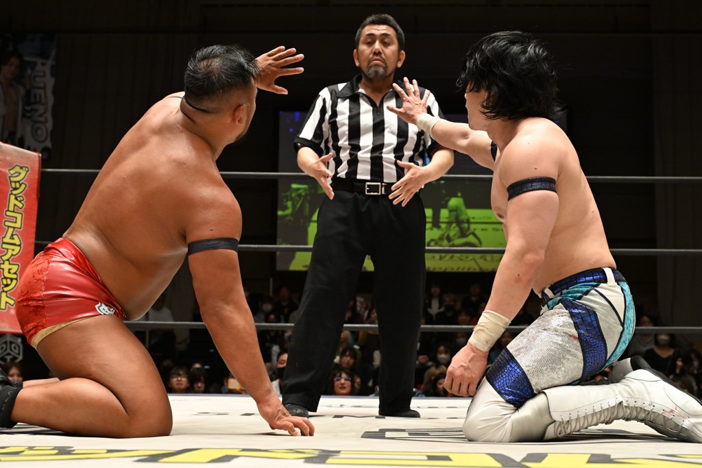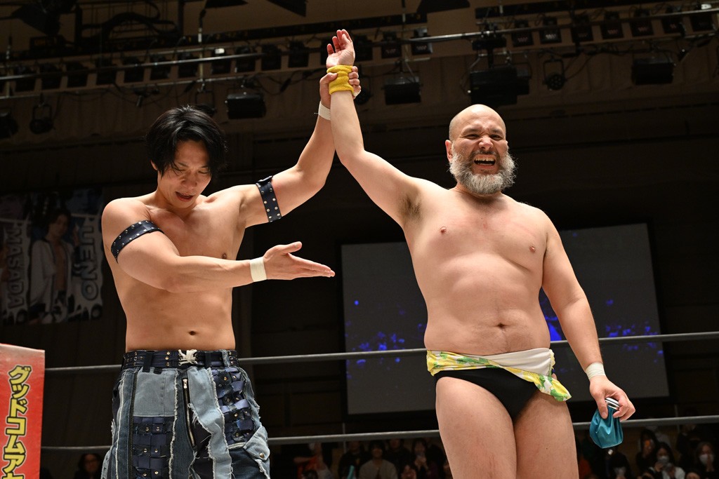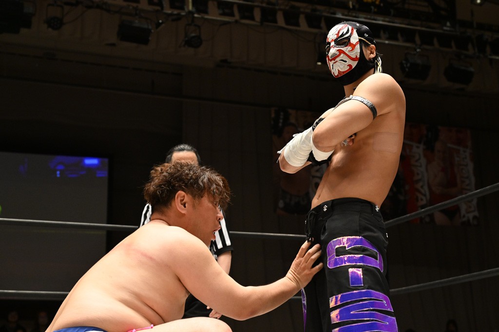 2人は昨年6・9後楽園での「DDTプロレス×新日本プロレス 一面対抗戦」で通じ合い、あれから10カ月の月日を経て、シングルマッチで相対した。