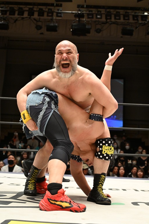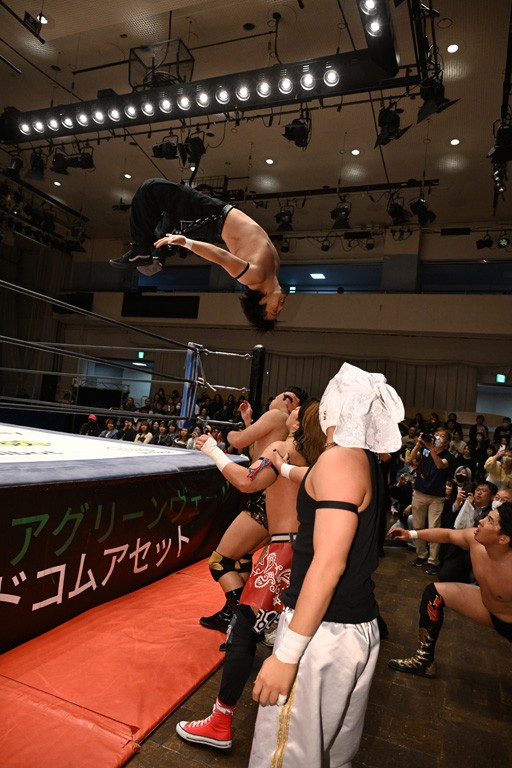 KO-Dタッグ王座を奪取したファンドラは2冠獲りを狙い、HARASHIMAと大地がバチバチに蹴り合い。自力初勝利でのベルト戴冠を目指す葛西は高鹿にミサイルキック、HARASHIMAが雪崩式ブレーンバスターで続いた。HARASHIMAが高鹿にミドルキック連打。高鹿がHARASHIMAに水車落とし。佐藤がHARASHIMAにミドルキックの乱れ打ち。大地がHARASHIMAに投げ捨てジャーマン。正田がHARASHIMAにスワンダイブ式ミサイルキック、クリスが正田の背中にセントーンをぶち込み、めまぐるしい攻防に。高鹿がHARASHIMAにトペを発射。正田が正田のチカラKOBUムキムキ狙いを回避したクリスは張り手から強烈なパイルドライバー。葛西が正田にランニング・エルボーバット、ブルドッキング・ヘッドロック。HARASHIMAがクリスにスワンダイブ式ボディプレスもカット。葛西が正田にSTFもカット。正田と大地が葛西に合体式フェースバスター。正田が葛西に投げ捨てジャーマンも、葛西はSTFで対抗。葛西が正田にグーパンチから逆さ押さえ込みも2カウント。正田は一気に正田のチカラKOBUムキムキを叩き込んで3カウントを奪った。