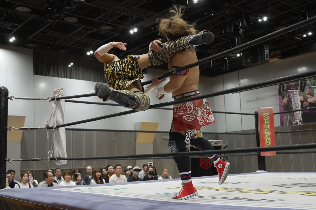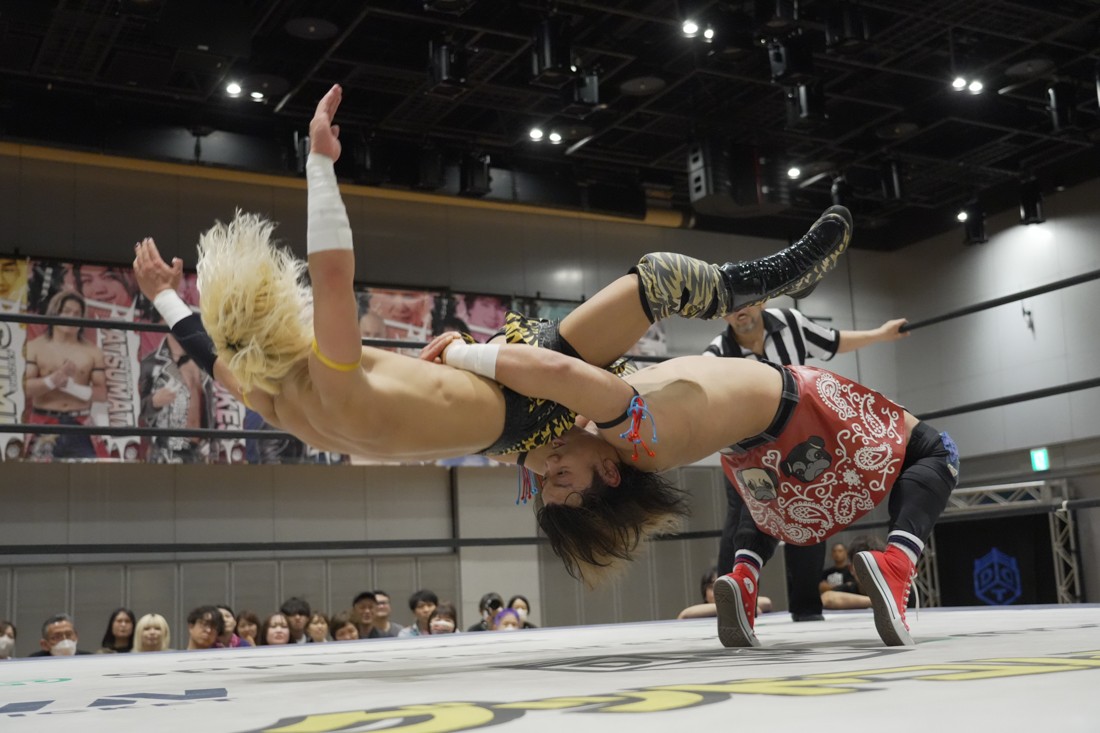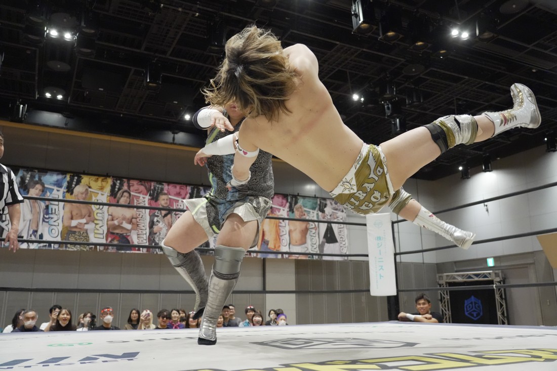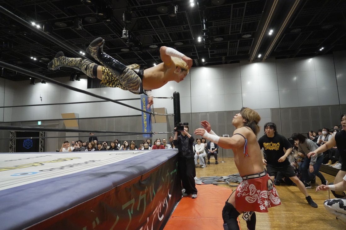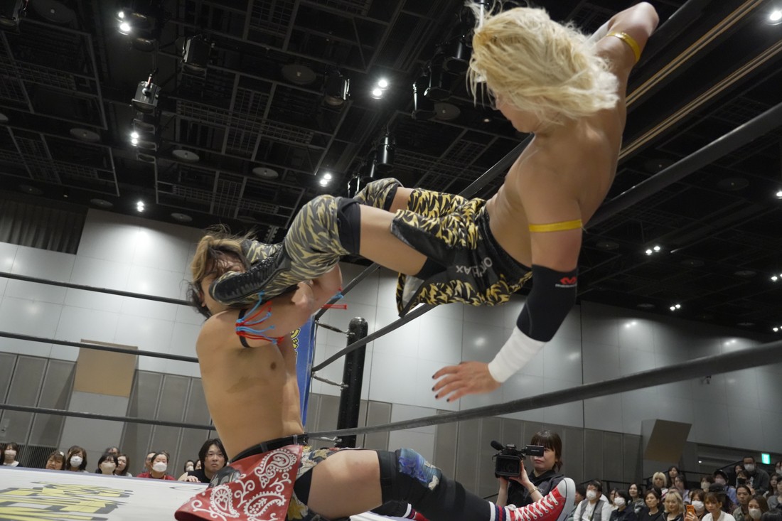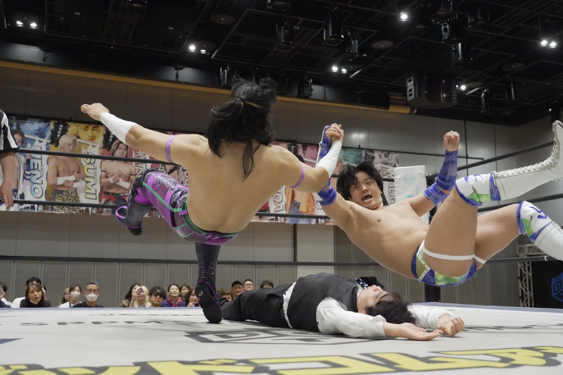 4月18日、福岡・アクロス福岡で「もつなべバスタ-」が開催。メインイベントでは須見和馬の持つDDT UNIVERSAL王座に勝俣瞬馬が挑戦。須見にとっては同じNωA Jr.のメンバーにして先輩の勝俣から挑戦表明された格好となったが、勝俣はリング下から大量のパイプイスを取り出して床にまき散らすと、リング上の須見に「降りてこい!」と挑発。挑発に乗った須見を場外で引きずり回した勝俣は、イス盛りの上にデスバレーボムで須見を叩き付ける。その後もシットダウン・パワーボムやKONOSUKE TAKESHITAばりのジャーマンスープレックスで須見を追い込んでいった勝俣だが、須見も隙あらばスク〜ルボ〜イを仕掛けていく。どうにかキックアウトした勝俣はととのえスプラッシュ2連発から¡Hasta la vista!で仕留めようとしたが、須見はこれをスク〜ルボ〜イで切り返し、がっつり体重を乗せて3カウントを奪った。